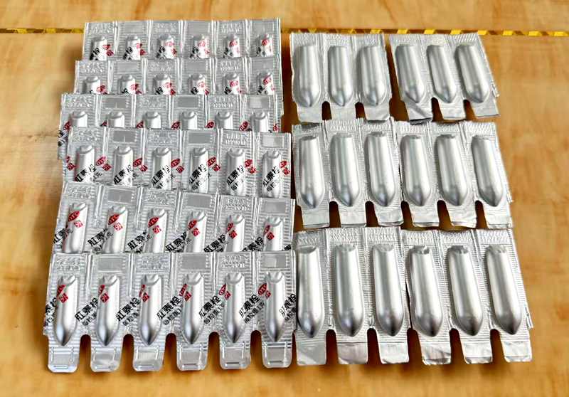 被冷却后的固态栓剂进入封口区:冷压模具→封口模具(封口)→打码模具(打批号)→滚刀(修剪上边)→计数剪切。