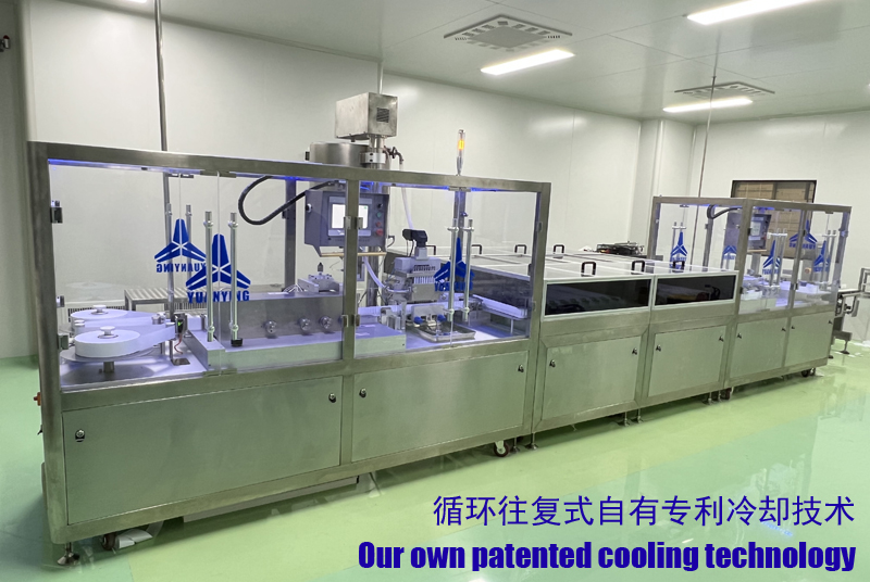 被冷却后的固态栓剂进入封口区:预热模具(预热)→封口模具(封口)→打码模具(打批号)→滚刀(修剪上边)→计数剪切。